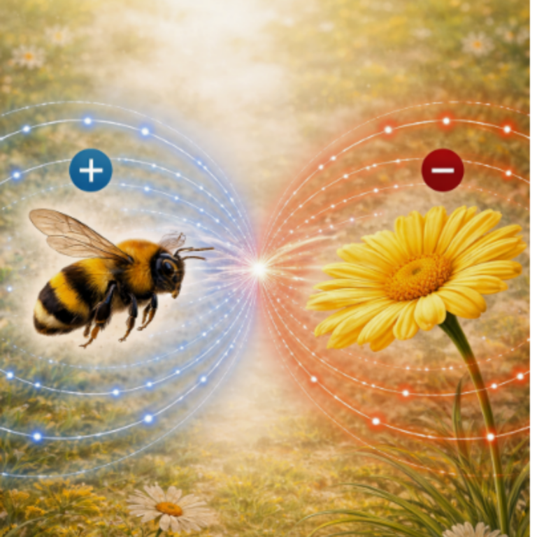 When a positively charged bee approaches a negatively charged flower, an electric field forms between them.
